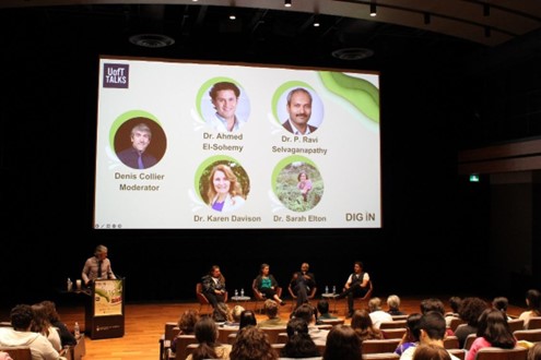 Every year, a core theme is selected by the UofT Talks team. Food science was the main theme for this year’s event, and four speakers with relevant expertise were invited to present a 10-minute TED Talk on their field of interest. The evening kicked off with Dr. Ahmed El-Sohemy talking about the role of genetics in our nutrition. One exciting segment of Dr. El-Sohemy’s talk explained how some people might have a particular genetic variant and how this could result in having varying caffeine tolerance or cause us to taste food products (e.g., cilantro) differently. This excellent talk was followed by Dr. Karen Davison, who told the audience about the relationship between nutrition, mental health, and physical health. The third speaker, Dr. Ravi Selvaganapathy, introduced the audience to the novel topic of cultured meat, which is meat that is composed in the laboratory, with the hope of having more sustainable meat production in the future. The fourth and final speaker, Dr. Sarah Elton, finished the first half of the event with a great talk on food sustainability.